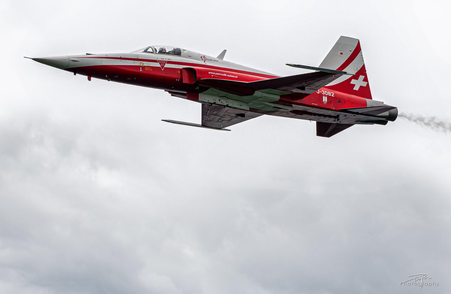 Patrouille Suisse trainiert über dem Bellechasse. Jedes Jahr trainiert die Schweizer Kunstflug Staffel mit ihren sechs rot-weissen Tiger F5 Flugzeugen ihr Vorführprogramm auch über dem Segelflugplatz Bellechasse.